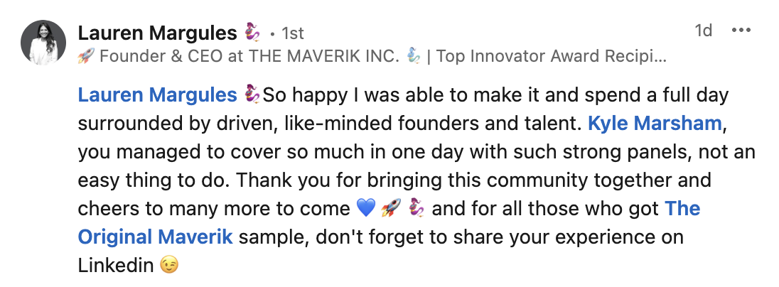 “Spent today at The Sport of Building Brands conference. A room full of founders, great speakers, and genuinely interactive sessions. Loved catching up with friends and making some new connections along the way. A worthwhile day all around.